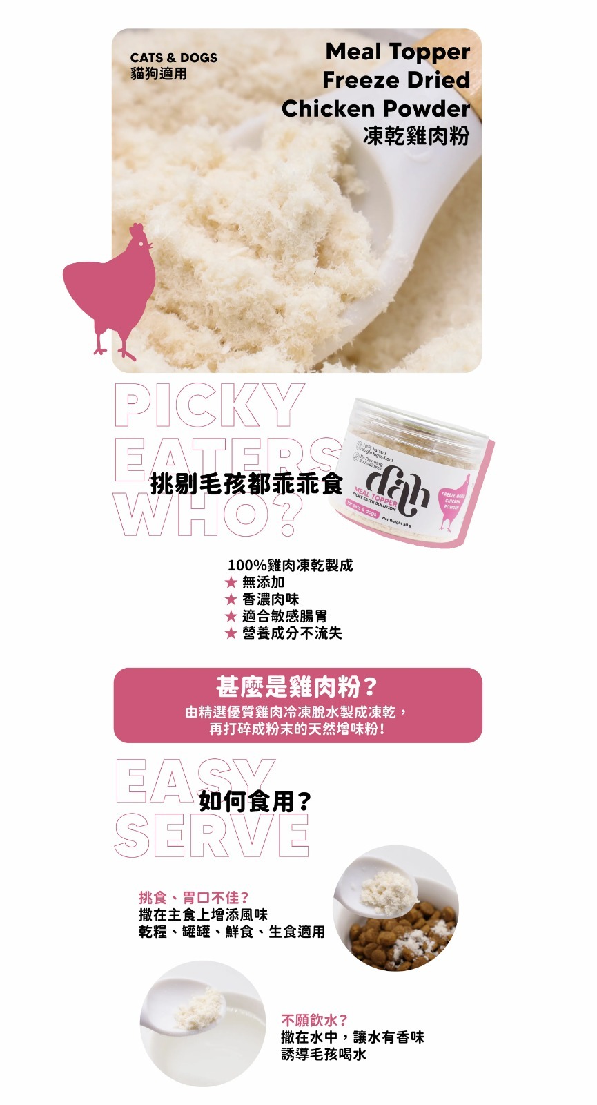 Just a sprinkle of dah meal topper and mix with your pet's current meal. Mealtime has never been so easy. Yum!