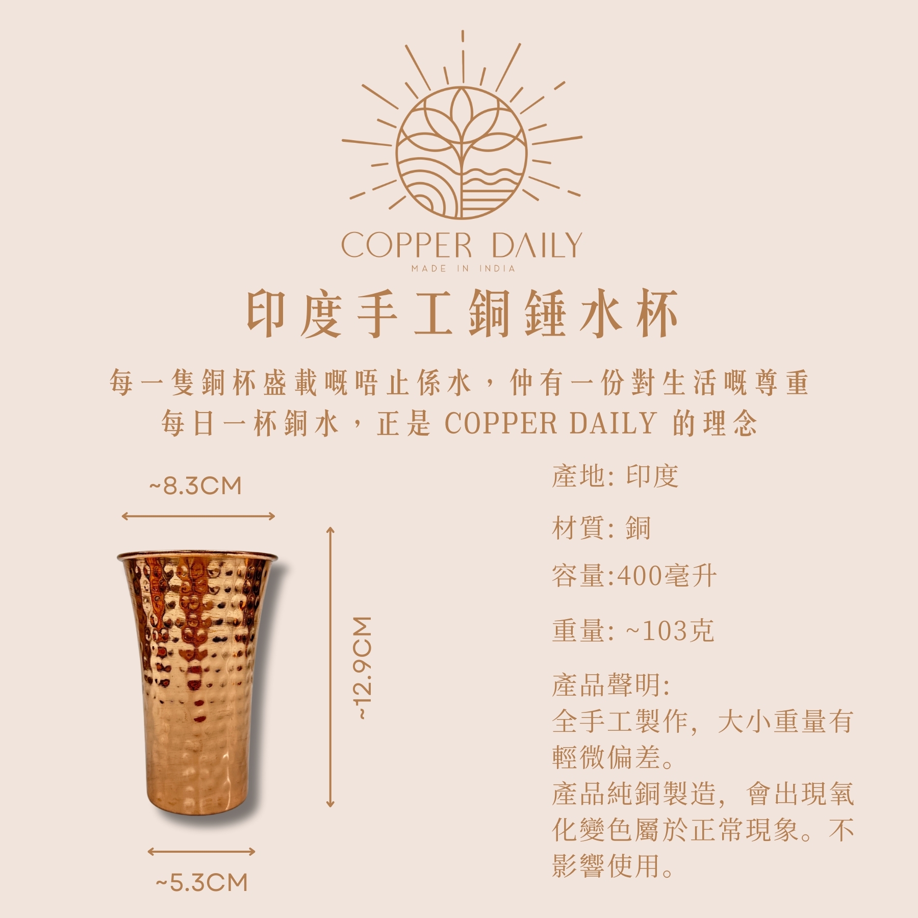Copper Daily 所推出嘅銅飲具,用上含量超過 99% 嘅高純度銅材質製造