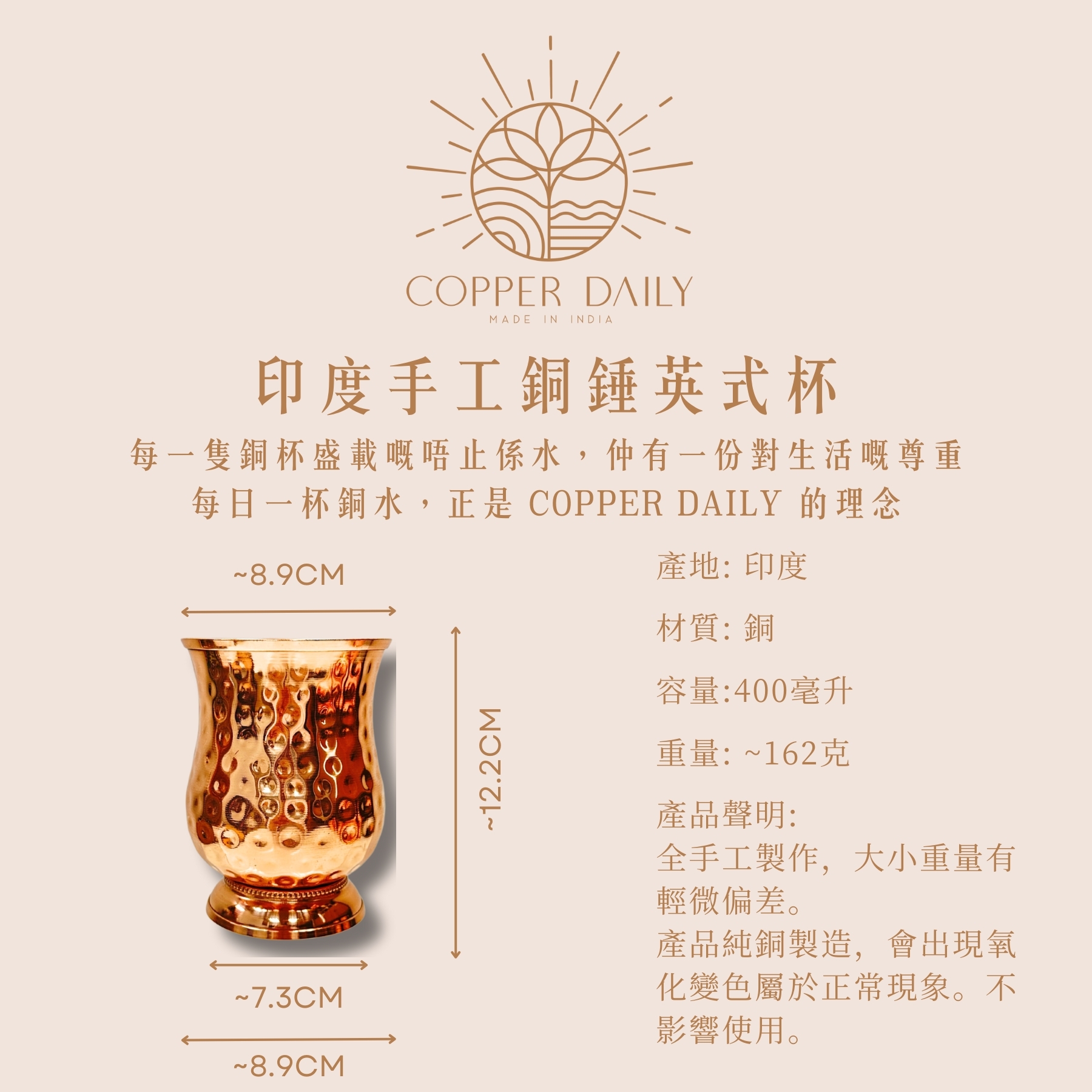 Copper Daily 所推出嘅銅飲具,用上含量超過 99% 嘅高純度銅材質製造