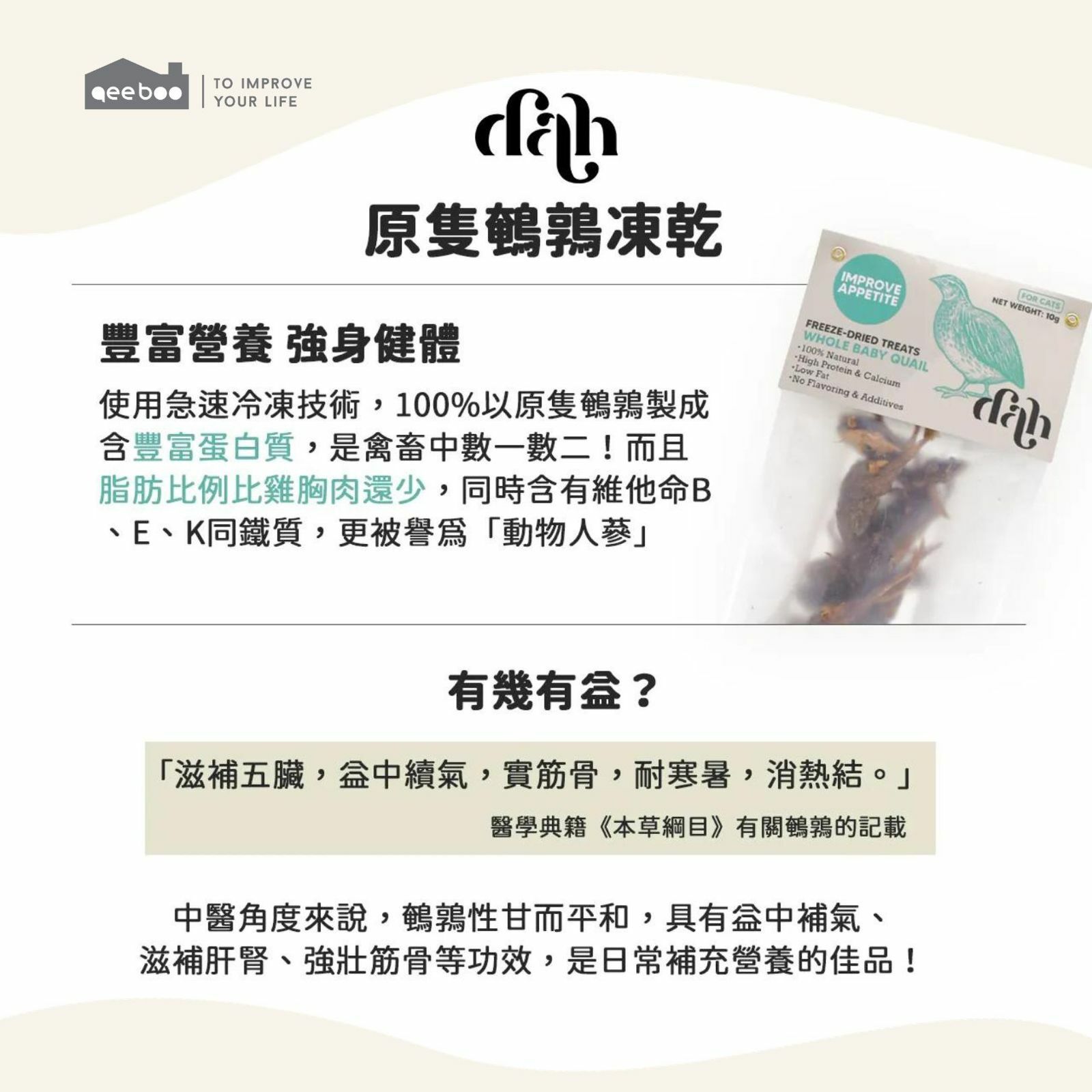 "成分天然,100% 鵪鶉