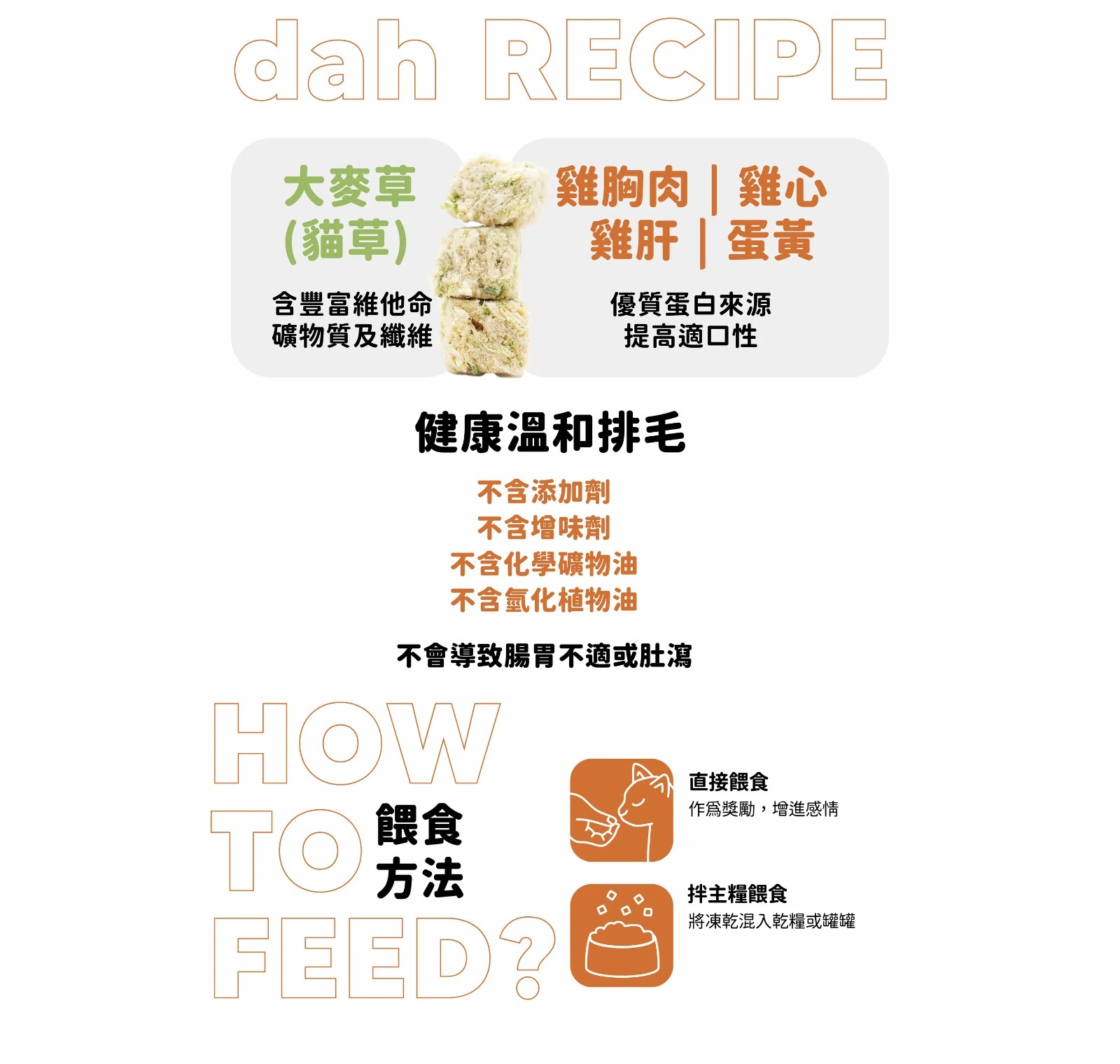 Made with natural ingredients: Wheatgrass, Chicken Breast, Chicken Heart, Chicken Liver, Egg Yolk