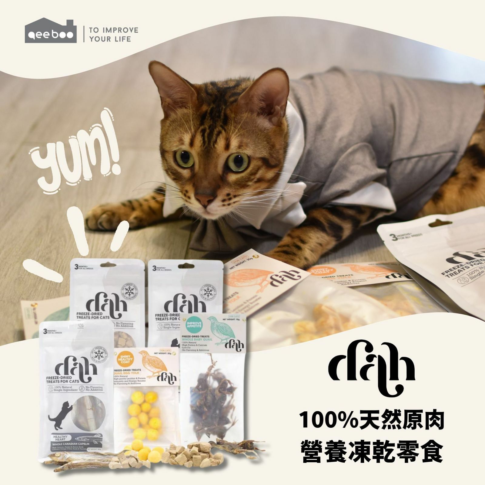dah 凍乾系列以單一動物肉類、內臟、骨頭製成。經過-40°C 鎖鮮製作過程,完整保留食材營養及鮮味,以最天然純淨的方式滿足寵物的真正營養需要。"
