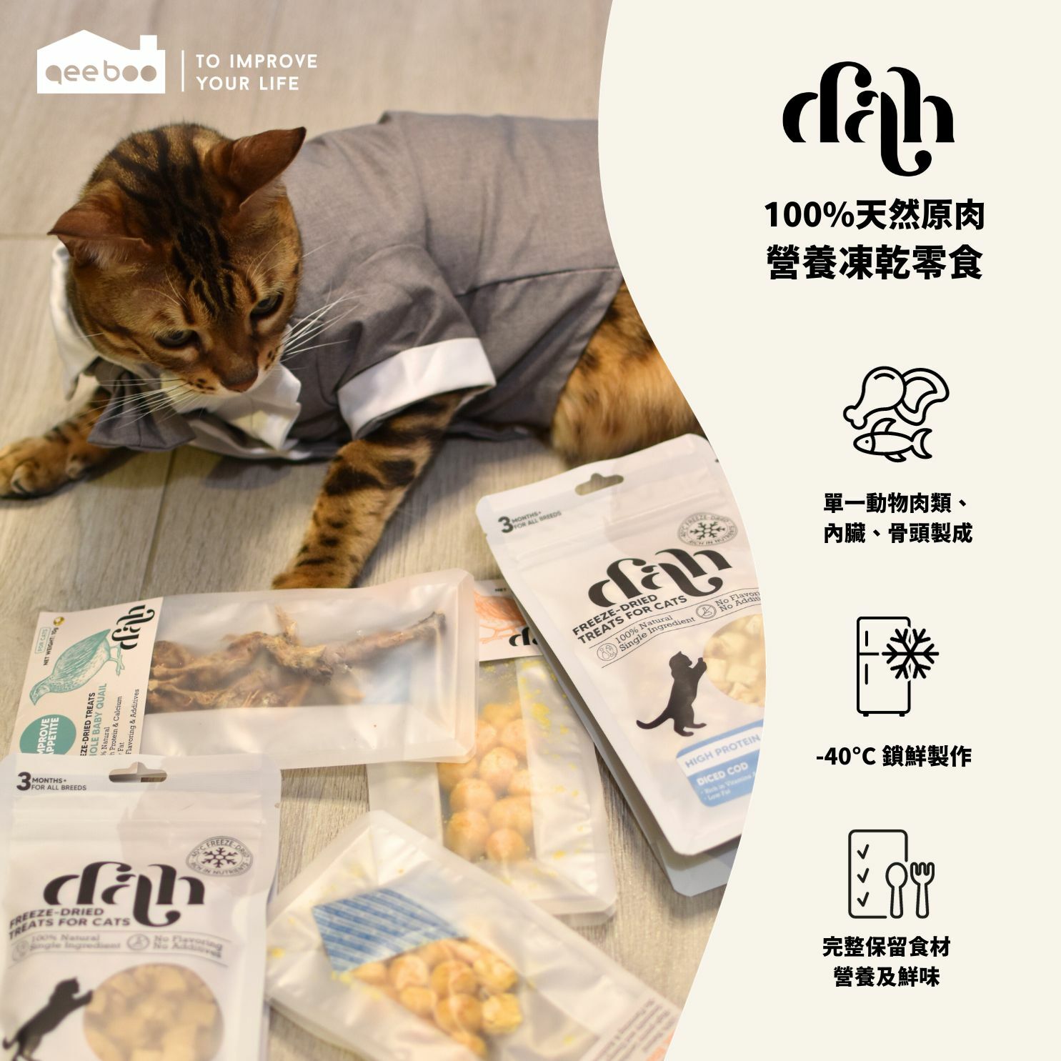 dah 凍乾系列以單一動物肉類、內臟、骨頭製成。經過-40°C 鎖鮮製作過程,完整保留食材營養及鮮味,以最天然純淨的方式滿足寵物的真正營養需要。"