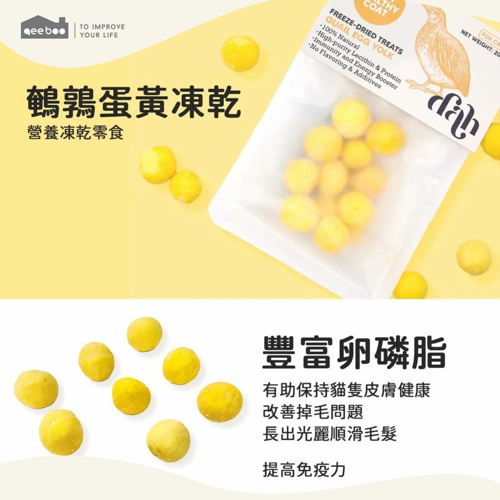 "成分天然,100% 鵪鶉蛋黃