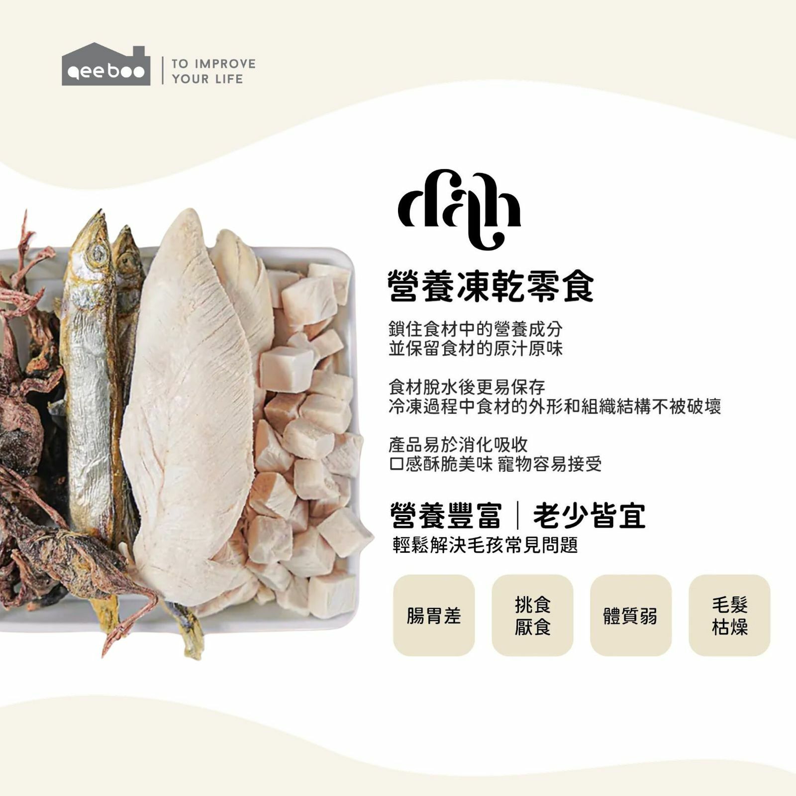dah 凍乾系列以單一動物肉類、內臟、骨頭製成。經過-40°C 鎖鮮製作過程,完整保留食材營養及鮮味,以最天然純淨的方式滿足寵物的真正營養需要。"